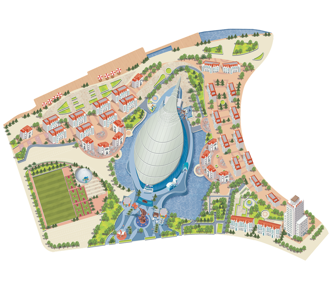 以巨型白色核心建筑为视觉中心,周边建筑呈半环绕式布局,形成强烈的主次关系,凸显地标性与画面秩序感。弱化路径,强调“场景”