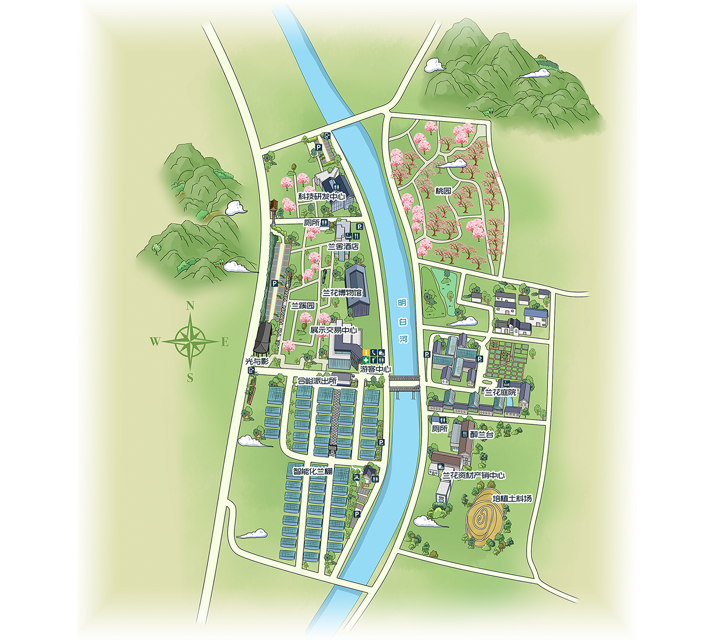 使用大面积的嫩绿色和草绿色,直接呼应了“生态农业”和“自然”的主题。桃园的粉色、河流的淡蓝色以及建筑的灰蓝色,色彩饱和度适中,不刺眼,给人一种宁静、治愈的田园感。规整与写意的平衡