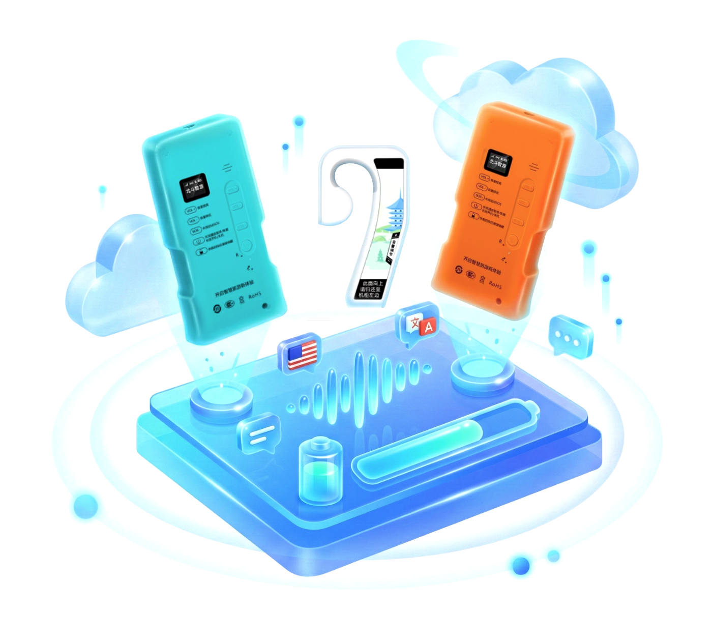 无人化租赁与智能管理:支持游客扫码租借、跨柜归还,24小时无人值守。实时监控设备状态、租借数据、收益情况,远程管理。精准生动的自动讲解:搭载高精度自动感应定位技术,游客行至景点附近时自动触发对应语音讲解,实现“走到哪,讲到哪”的沉浸式体验。系统支持多语种切换,满足不同国籍游客的需求。灵活配置与强大定制能力