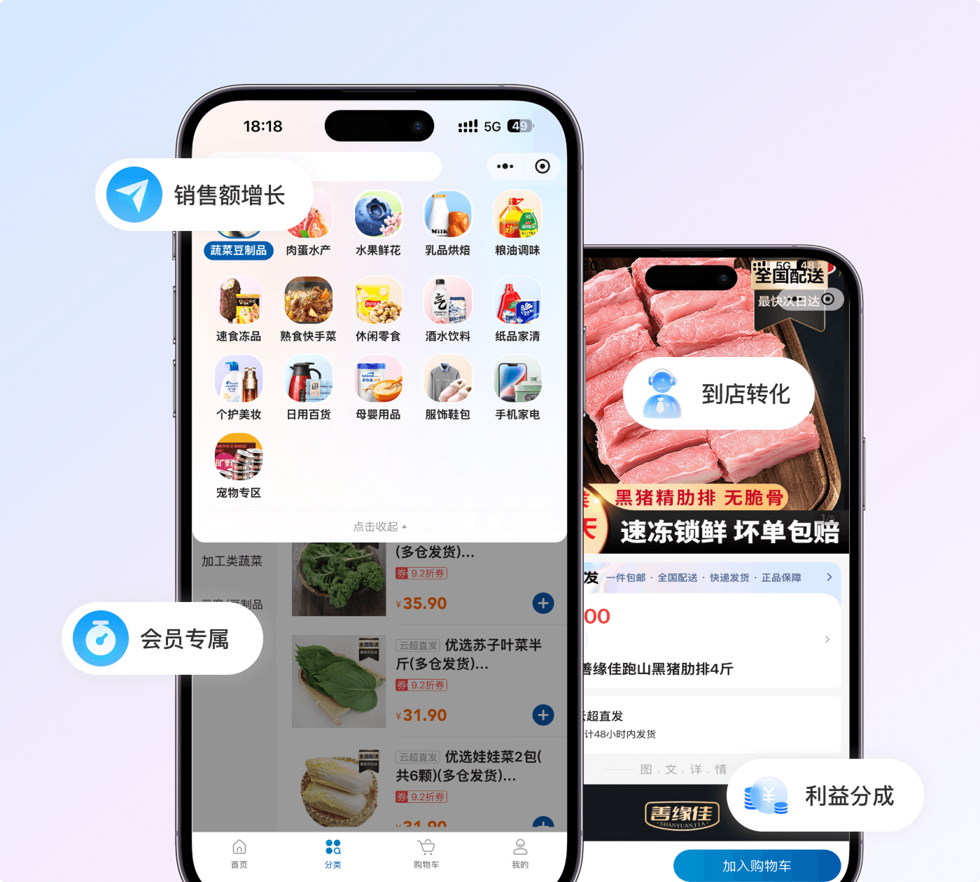 微商城支持6端(微信公众号、小程序、小红书、抖音、支付宝、快手)同步展示,提供50+营销活动及页面装修组件。