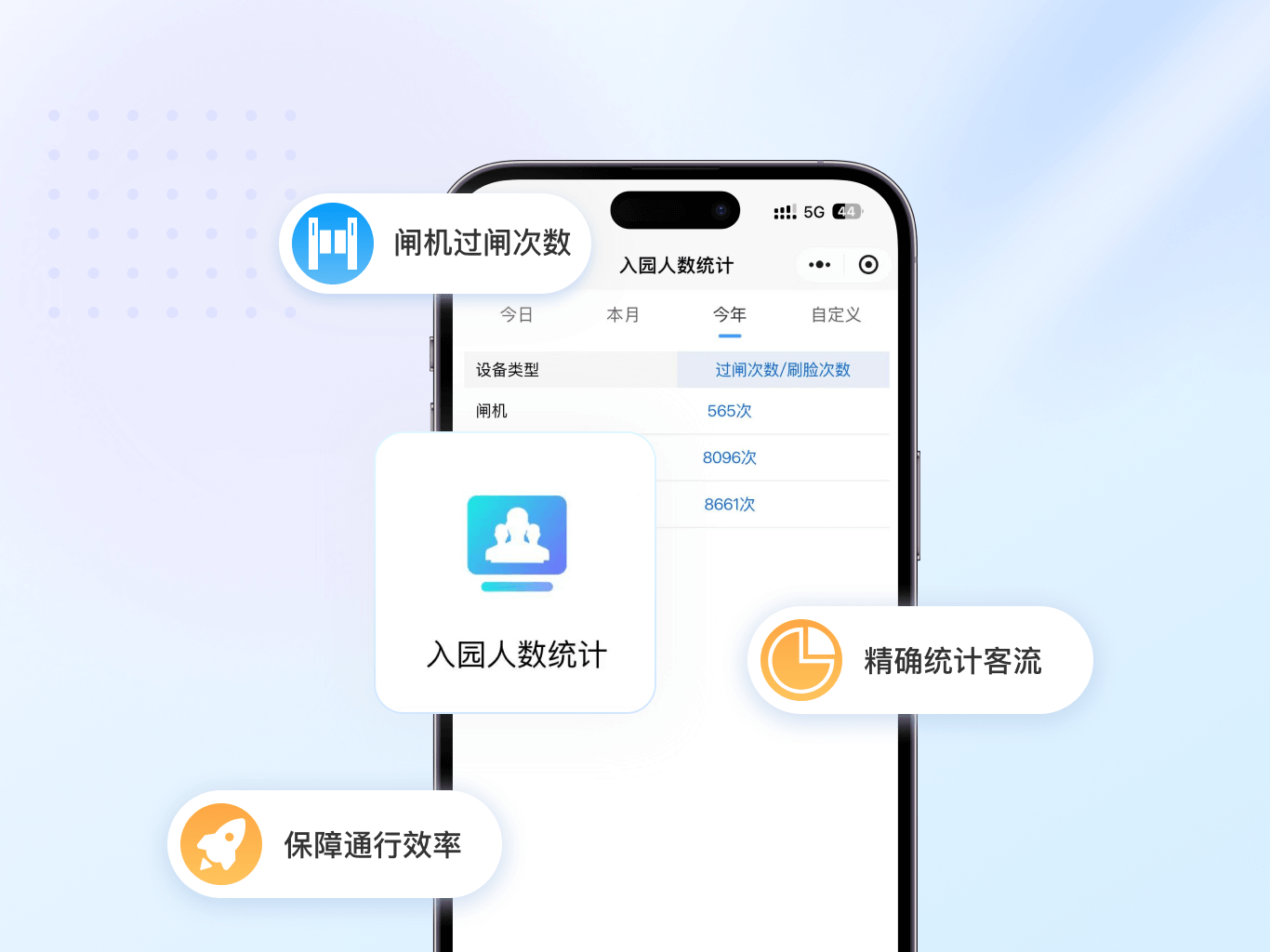 - 客流精准化,基于硬件数据支撑通过对接人脸识别闸机等硬件,提供“当日游客进园总量”、“当前园内游客量”等精准客流数据。
